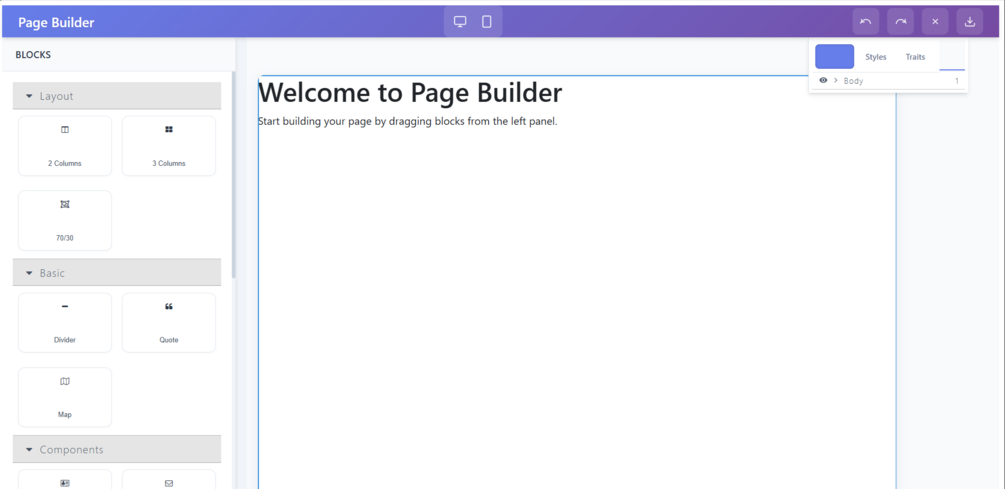 - The Page Builder app (drag-and-drop editor).